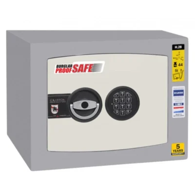 A compact burglar-resistant safe (Griffon H.28.E) designed to securely protect your valuables with reliable locking and strong construction for home or office use.